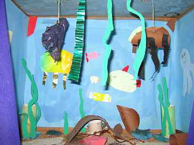 Während der Projektwoche im Juni 2005 sind in den jahrgangsübergreifenden Projektgruppen der dritten und vierten Klassen auch Unterwasserwelten im Bananenkarton gebastelt worden: