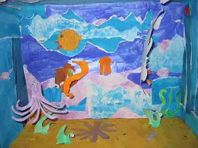 Während der Projektwoche im Juni 2005 sind in den jahrgangsübergreifenden Projektgruppen der dritten und vierten Klassen auch Unterwasserwelten im Bananenkarton gebastelt worden: