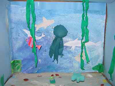 Während der Projektwoche im Juni 2005 sind in den jahrgangsübergreifenden Projektgruppen der dritten und vierten Klassen auch Unterwasserwelten im Bananenkarton gebastelt worden: